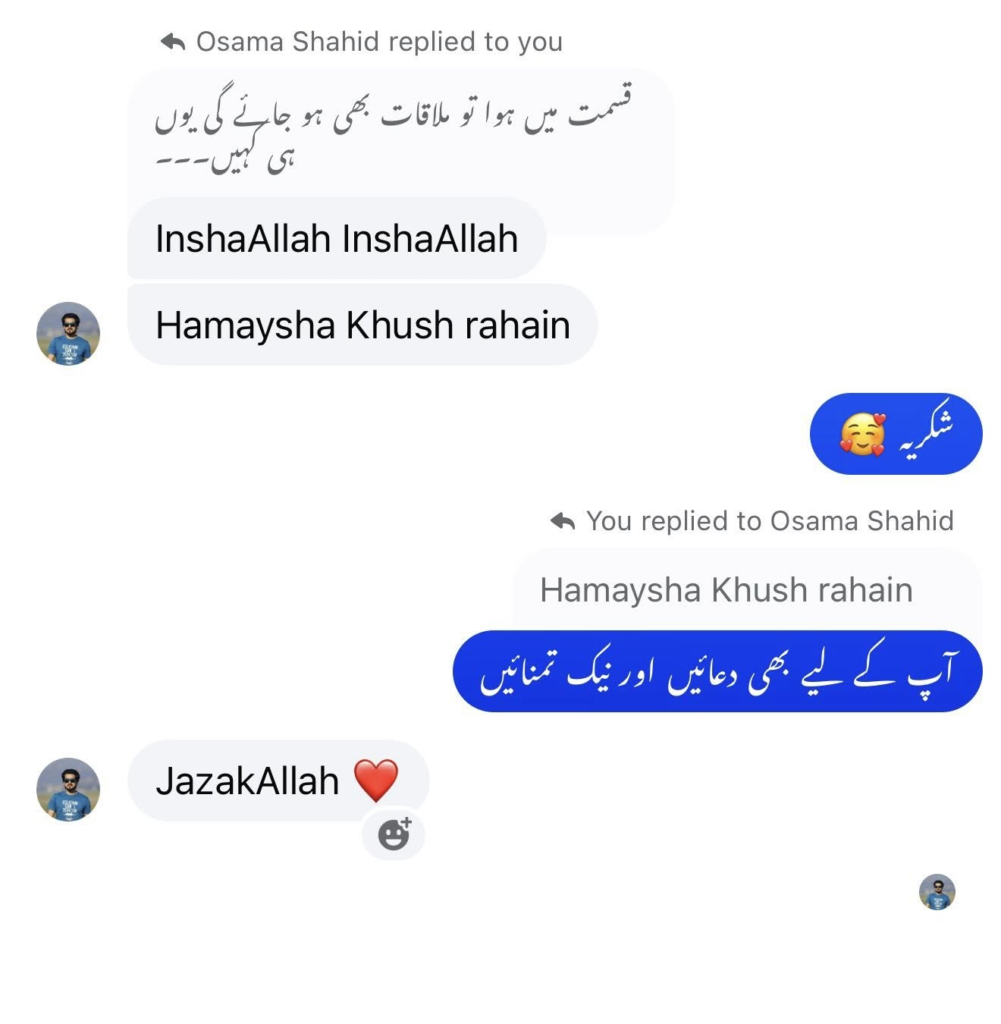 یکم جولائی ۲۰۲۴ کو مجھے میسنجر پر اسامہ شاہد بنگش کا پہلا میسج آیا۔