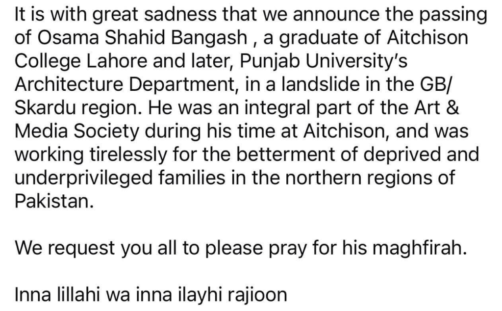 اس سال جب میں کے ٹو ٹریک سے واپس آئی تو ۷ اگست کو مجھے اسامہ کا تیسرا میسج آیا۔ ان سے حسبِ روایت مختصر اور شائستہ گفتگو رہی جو ہر بار کی طرح اگلے ٹریک پر مبنی تھی۔ اس کے بعد اسامہ میرے ساتھ ایڈ بھی ہو گئے۔ میں نے جانتی تھی کہ یہ میری ان سے آخری گفتگو ہے اور وہ ایک ہفتے بعد اچانک سے اس دنیا سے رخصت ہو جائیں گے۔ ٹریکرز اکثر پہاڑوں میں ایک دوسرے سے ٹکرا جاتے ہیں۔ میں نہیں جانتی تھی کہ پہاڑوں کے اس شیدائی اور سلجھے انسان سے میری کبھی ملاقات نہیں ہو پائے گی اور وہ ابدی سفر پر روانہ ہو جائیں گے۔ ۱۵ اگست کو سکردو روڈ پر لینڈ سلائیڈنگ ہوئی اور پتھر اسامہ کی گاڑی کو لگا۔ دیگر لوگ محفوظ رہے لیکن اسامہ جان کی بازی ہار گئے۔ یہ خبر یقیناً ان کے دوستوں اور خاندان کے لیے ناقابلِ یقین ہو گی۔ ایک ایسا زخم جو کبھی نہیں بھرے گا۔