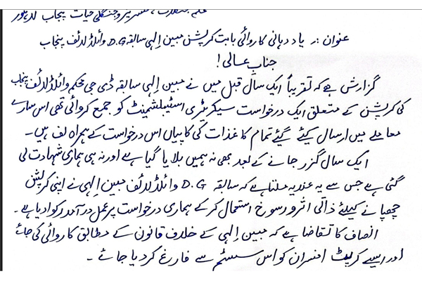تفصیلات کے مطابق جہلم کے شہری اور مقامی سی بی او کے سیکرٹری جنرل راجہ محمد قیصر نمبردار نے وفاقی وزیر برائے موسمیاتی تبدیلی مصدق ملک، اسٹیبلشمنٹ ڈویژن اور وزیراعلیٰ پنجاب کو ڈی جی وائلڈلائف کے خلاف مبینہ کرپشن کے شواہد پر مبنی متعدد درخواستیں ارسال کیں۔ درخواست گزار کے مطابق مختلف فورمز پر شکایات جمع کرانے کے باوجود عملی کارروائی نہیں کی گئی۔