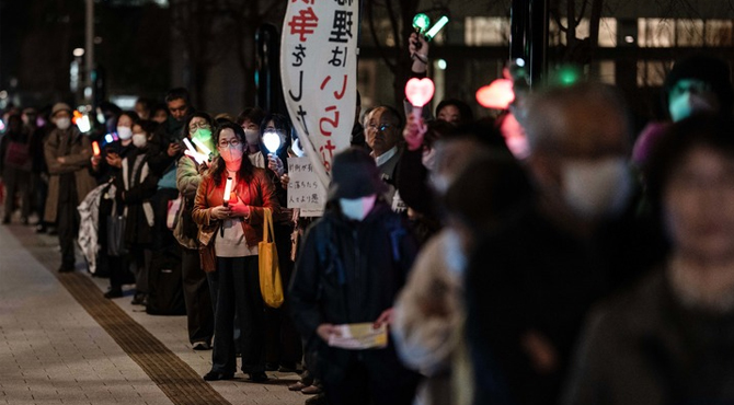 ٹوکیو (شِنہوا) جاپانی شہریوں کی بڑی تعداد نے دارالحکومت ٹوکیو میں وزیراعظم تاکائیچی کی طرف سے آئینی ترامیم کے عمل کو تیز کرنے، عسکری صلاحیتوں میں اضافے اور قومی انٹیلی جنس کے کام کو مستحکم کرنے جیسی پالیسیاں اختیار کرنے کی خطرناک روش کے خلاف احتجاجی مظاہرہ کیا۔ مظاہرین نے ملک کی مستقبل کی سمت کے متعلق بھی تشویش کا اظہار کیا۔