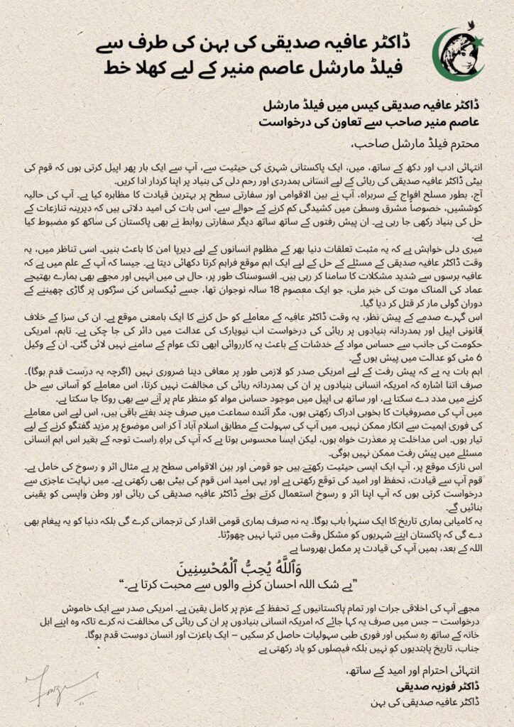 اسلام آباد: ڈاکٹر عافیہ صدیقی کی بہن ڈاکٹر فوزیہ صدیقی نے اسلام آباد میں ہونے والے مذاکرات کے دوران فیلڈ مارشل عاصم منیر سے امریکہ سے اپنی بہن کی رہائی کا مطالبہ کرنے کی اپیل کی۔