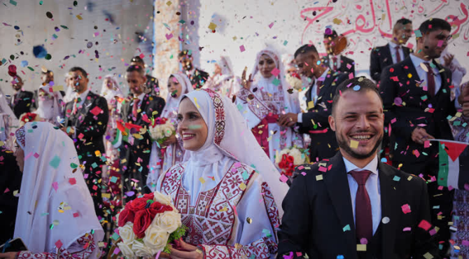 غزہ میں تباہ اور جنگ کے سائے میں خوشیوں کے شامیانے، 54 جوڑوں کی اجتماعی شادی