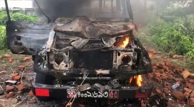 بنگلہ دیش میں عوامی لیگ کے حامیوں کا مظاہرہ، فوجی گاڑی نذر آتش