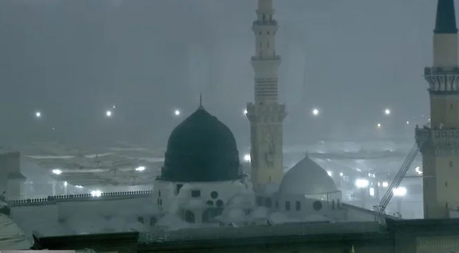 سعودیہ عرب ، بارشیں اور سیلابی صورتحال، مسجد نبوی ؐ میں نمازیوں کی بارش کے دوران دعائیں