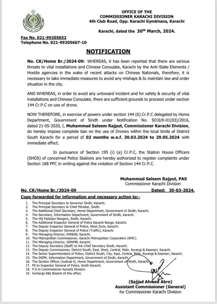 KARACHI(National Times) After a recent attack on Chinese nationals in Pakistan, the Karachi commissioner has imposed a ban on the use of drone cameras for two months in the district south of the port city citing “threats to vital installations, and Chinese Consulate”.