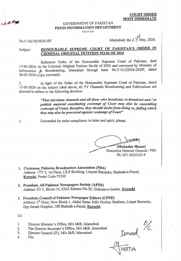 A notification issued by the Press Information Department (PID) referred to the Supreme Court’s May 17 order wherein it issued show-cause notices to independent Senator Faisal Vawda and Muttahida Qaumi Movement-Pakistan (MQM-P) leader Mustafa Kamal in contempt of court proceedings over their hard-hitting pressers against the judiciary.