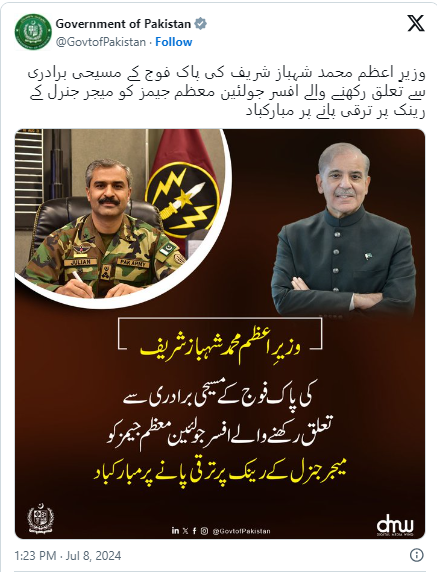 Islamabad (National Times) Prime Minister Shehbaz Sharif has congratulated Julian Moazzam James, a Pakistan Army officer belonging to the Christian community, on his promotion to the rank of major general.