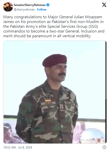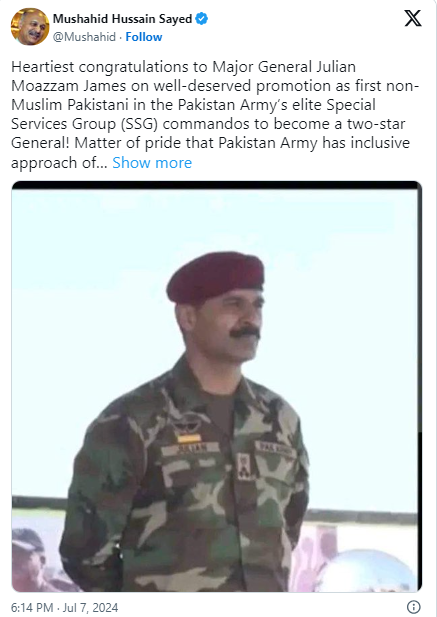 Mushahid Hussain Sayed, a former senator and head of Pakistan-China Institute and Pakistan-Africa Institute for Development & Research, lauded James for becoming the first non-Muslim in the military’s Special Services Group to attain the rank of a two-star general.