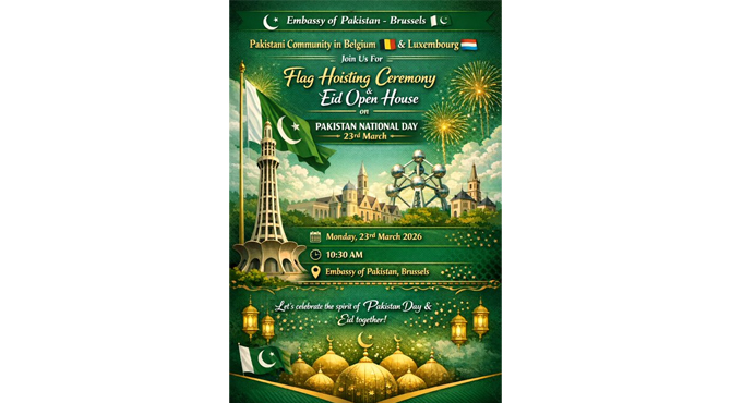 Brussels (National Times) The Pakistan Day will be celebrated with national pride and festive spirit as the Embassy of Pakistan in Brussels invites the Pakistani community living in Belgium and Luxembourg to attend a special Flag Hoisting Ceremony and Eid Open House on Monday, 23 March 2026.